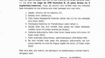 (IPB-Betanu, 24 Abril 2023) – Institutu Politékniku Betano(IPB) serbisu hamutuk ho Ministeriu Agricultura ne’ebé kopera ho Ajénsia Arava International Center for Agriculture Training (AICAT) loke oportunidade ba alumni Eskola Superior Agronomia i Zootéknika – Kursu Produsaun Animal (ESAZ- KPA) tuir treinamentu serbisu nian “On Job training” iha Israel durante fulan 11 nia laran. Husu ba … Continue reading AVIZU – OPORTUNIDADE BA ALUMNI KPA “ON JOB TRAINING” IHA ISRAEL