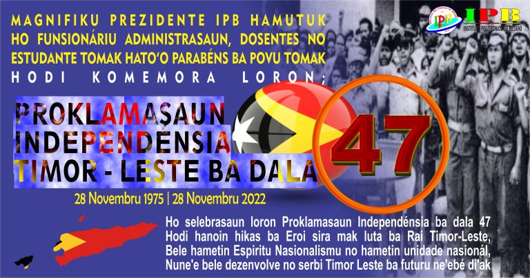 Betano, 28 Novembru 2022 Institutu Politékniku Betano nia Magnífiku Prezidente IPB no Sívitas Akadémika hotu hakarak hato’o Parabéns ba povu tomak hodi komemora loron Proklamasaun Indepedénsia Timor – Leste ba dala 47, hodi hanoin hikas ba Eroi sira ne’ebé mak luta ba rai ida ne’e.Mídia IPB
